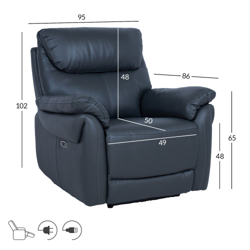 Положення спинки і підніжки для ніг крісла типу "реклайнер" змінюється за допомогою електричного механізму. Коли підніжка плавно рухається вгору , спинка плавно рухається разом з нею. Кнопки регулювання та USB-порт розташовані на зовнішній стороні підлокітника.